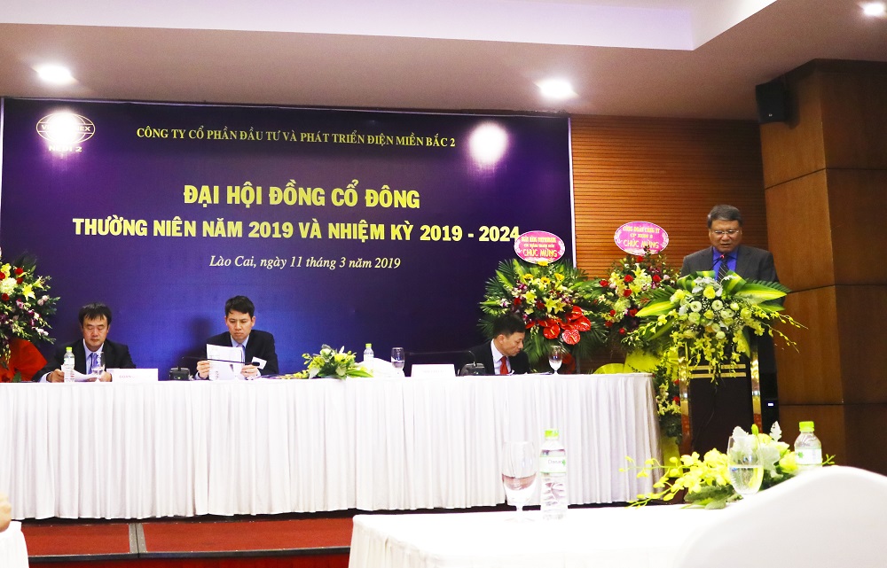 Chiều ngày 11/03/2019 Công ty Cổ phần Đầu tư và Phát triển Điện Miền Bắc 2 đã tổ chức Đại hội đồng cổ đông thường niên năm 2019 tại Tầng 3 Khách Sạn Mường Thanh, đường Thanh Niên, thành phố Lào Cai, tỉnh Lào Cai. Đúng 13h30 phút Đại hội đã chính thức khai mạc.